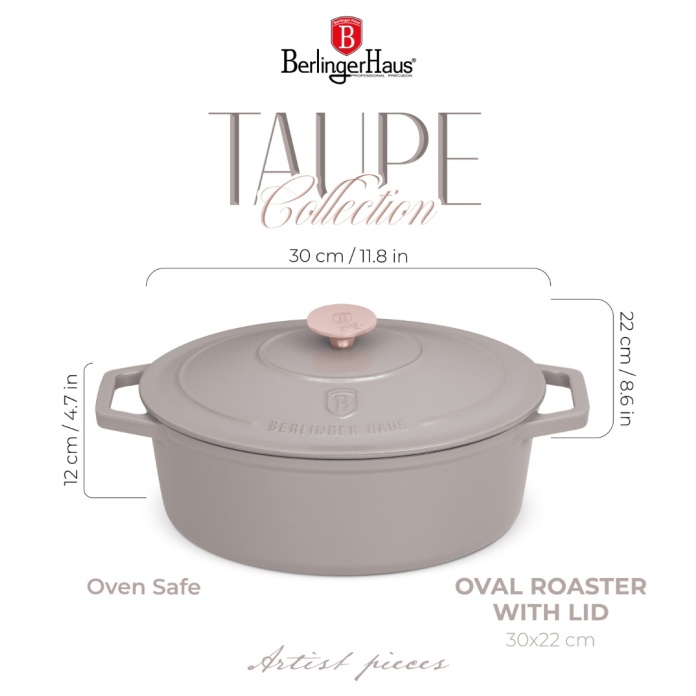 Garnek żeliwny owalny 4,65l z pokrywką 30cm Berlinger Haus Taupe BH-6541 | OUTLET