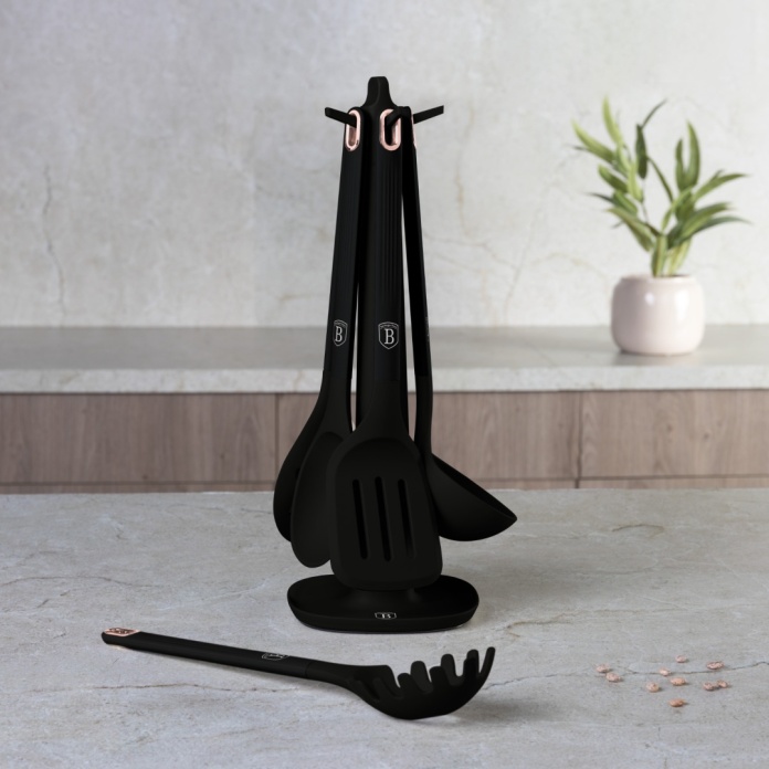 Materiał: Nylon Kolor: Czarny z różowo- złotymi / miedzianymi akcentami Kolekcja: Black Rose Collection +Nie przenoszą zapachów jedzenia +Nie rysują powłoki naczynia +Odporne na wysokie temperatury - nawet do 210C. Zawartość zestawu: Łopatka Łyżka cedzakowa Łyżka wazowa Łyżka kuchenna Chochla do spaghetti Stojak obrotowy