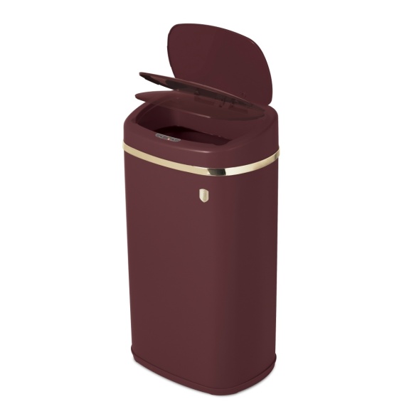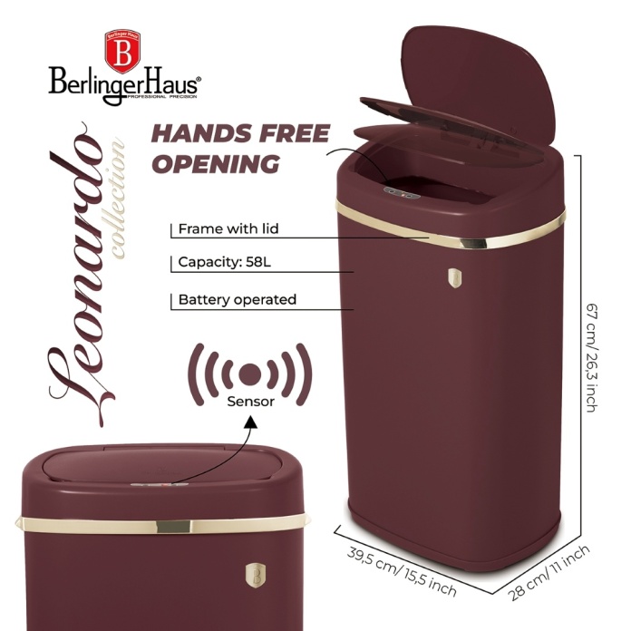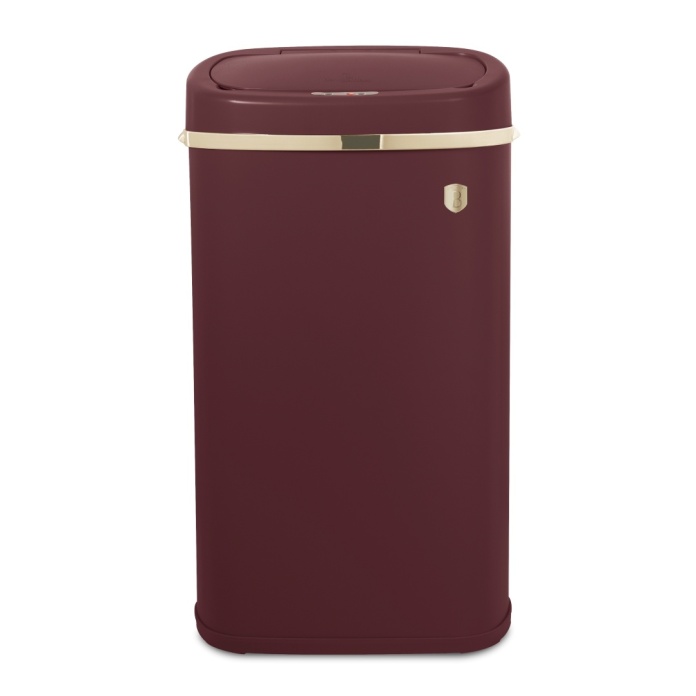 Materiał: żelazo Wymiary: 67 x 39,5 x 28 cm, pojemność 58 L Zasilanie: 4 baterie AA (brak w zestawie) Kolor: matowe bordo z elementami w kolorze złota Wbudowany czujnik Ramka z pokrywką
