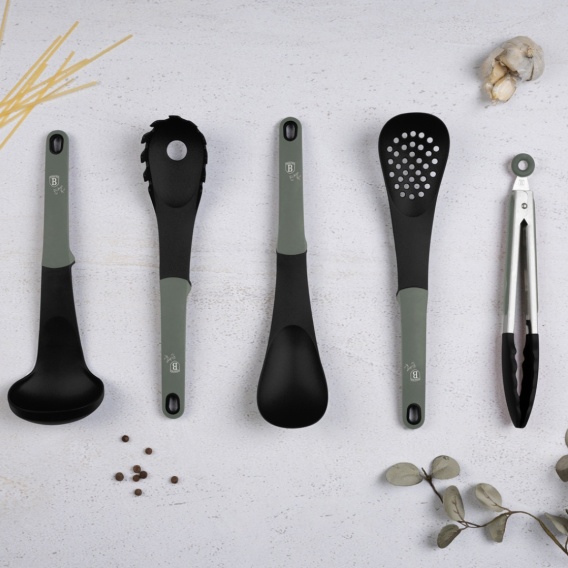 Materiał: nylon, plastik Kolor: matowa zieleń Zestaw zawiera: Chochla do zupy (1 szt.) Łyżka kuchenna (1 szt.) Łyżka do spaghetti (1 szt.) Łyżka z cedzakiem (1 szt.) Szczypce kuchenne (1 szt.)