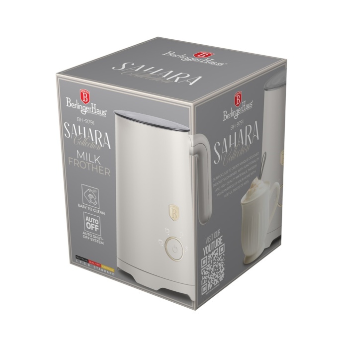 Model: BH-9791 Kolekcja: Sahara Collection Materiał: stal nierdzewna, tworzywo sztuczne Kolor: kremowy Pojemność do podgrzewania: 300 ml Pojemność do spieniania: 160 ml Napięcie: 220–240V, 50/60Hz Moc: 400 W Zakres temperatury grzania: 55–65 °C