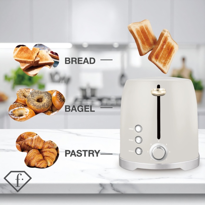Toster, kolekcja FashionTV, Matte Cream Gold FTV-0112 • Materiał: stal nierdzewna 18/10 • 220–240V 50/60 Hz 850W • Kolor: kremowy matt - złoto • Funkcja szybkiego nagrzewania • Automatyczne centrowanie pieczywa • Funkcje: anulowanie, rozmrażanie, podgrzewanie • Antypoślizgowy spód • Wysuwana tacka na okruszki • 7 poziomów opiekania • Schowek na przewód